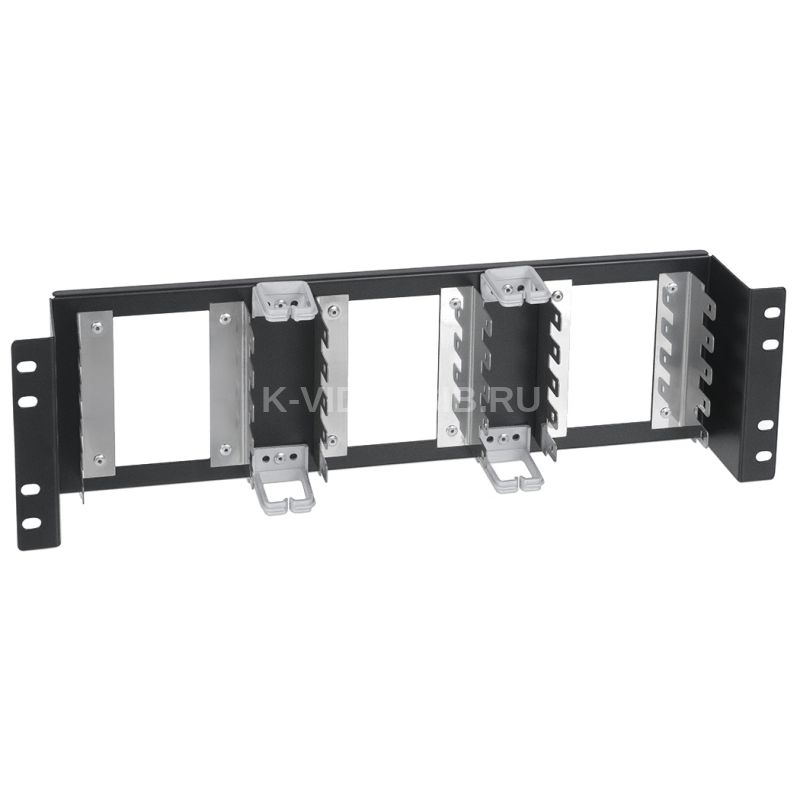 Рама 19” с монтажными хомутами, предназначена для установки на неё 15-ти плинтов типа KRONE. Используется для установки в шкафы и стойки стандарта 19”.