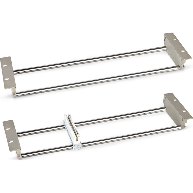 Рама-штанга, с круглыми направляющими, предназначена для установки на неё 10-ти парных плинтов типа KRONE. Используется для установки в шкафы и стойки стандарта 19”. Высота конструктива составляет 3U. Количество плинтов, которые можно установить на такой конструктив, составляет 18 шт. Из-за конструктивных особенностей подключение заземления невозможно.