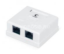 Неэкранированная компьютерная розетка настенного монтажа. Соответствует характеристикам категории 5е. Имеет 2 порта RJ-45 (8р8с). На печатной плате установлены контакты типа Dual IDC с цветной маркировкой по двум стандартам: T568 А и B. Ножи контактов располагаются под 45°, что лучше сказывается на передаточных характеристиках разъема. Для заделки проводников подходят ножи тип 110 и Krone. В комплект розетки входит двусторонняя клеевая площадка, винты для крепления к стене и стяжки для фиксации кабелей в розетке.
