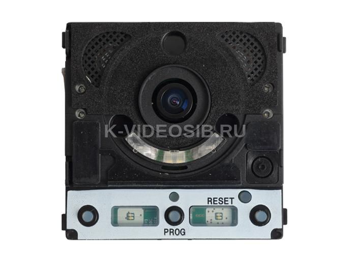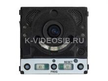 Электронный модуль в корпусе из технополимера с 2 кнопками вызова и двойной синей или белой подсветкой карточек абонентов. Камера PAL/NSTC разрешением 680x512 пикселей со встроенным микропроцессором для цифровой обработки сигнала. Объектив «рыбий глаз» с углом обзора 100° по горизонтали и 82° по вертикали с регулируемым цифровым увеличением. 2 белых сверхъярких светодиода подсветки и антибликовый рассеиватель. Оснащается клеммой для подключения электромеханического замка, дополнительным контактом (1 A, 30 В макс.), входами для кнопки открытия двери и контроля за состоянием двери (программируемый вход/выход), выходом для активации внешних камер (программируемый вход/выход). На передней стороне располагаются светодиоды для визуальной индикации состояния системы. Регулировка чувствительности микрофона, громкости динамика и времени открытия/закрытия электрозамка. Программирование в ручном режиме или с помощью ПК, подключенного через фронтальный коннектор MINI USB.