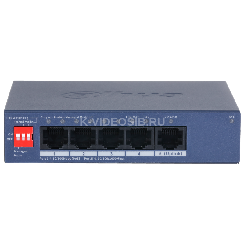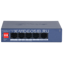 Коммутатор сетевой 5 портовый гигабитный с РоЕ; 4xRJ45 PoE 10/100 Мбит/с, IEEE 802.3af/at, до 30Вт; 1xRJ45 Uplink 10/100/1000 Мбит/с; PoE бюджет до 40 Вт; DHCP, VLAN, внешний БП DC 53В, 0.8 A, 42Вт; грозозащита 6кВ; -10... +55°C; 115х84х27 мм.