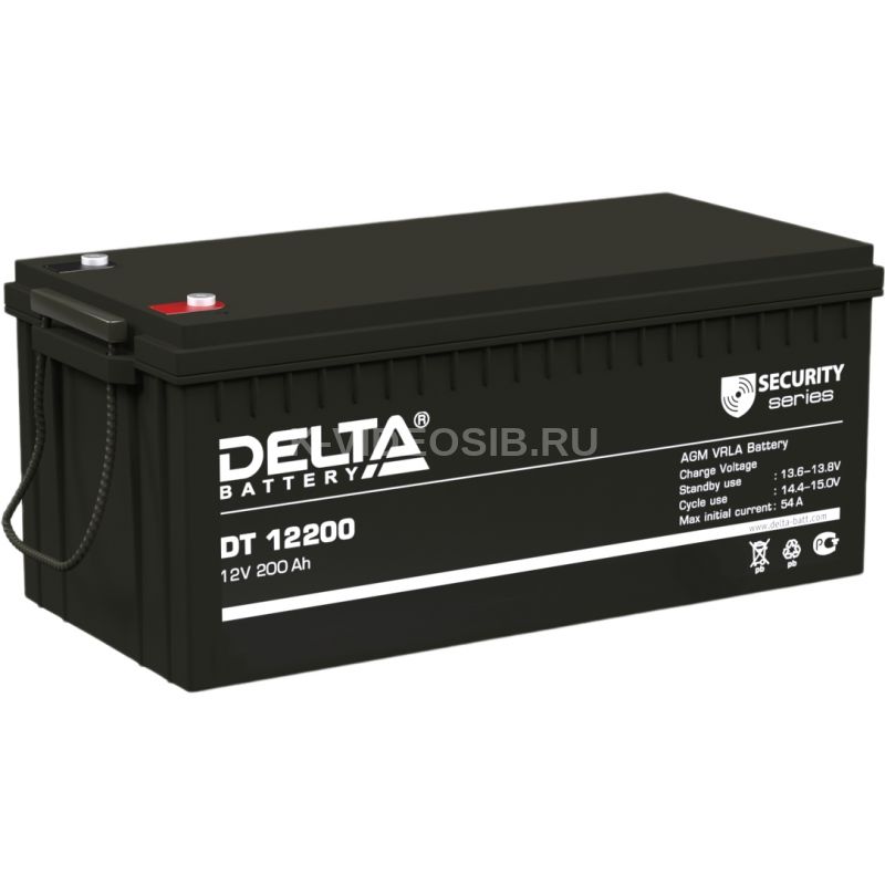 Герметизированный VRLA cвинцово-кислотный аккумулятор Delta DT 12200 напряжением 12В и емкостью 200Ач изготовлен по технологии AGM (с микропористым заполнителем, пропитанным электролитом). Корпус изготовлен из негорючего ABS пластика. Срок службы аккумулятора рассчитан на 7-10 лет работы. Аккумулятор предназначен для работы в режиме постоянного подзаряда (т.н. буферный режим), обладает низким внутренним сопротивлением и саморазрядом.