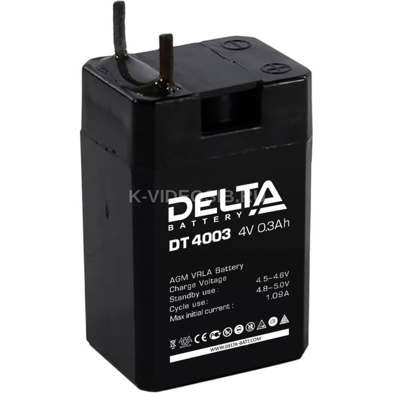 Герметизированный VRLA cвинцово-кислотный аккумулятор Delta DT 4003 напряжением 4В и емкостью 0,3 Ач изготовлен по технологии AGM (с микропористым заполнителем, пропитанным электролитом). Корпус изготовлен из негорючего ABS пластика. Срок службы аккумулятора рассчитан на 3-5 лет работы. Аккумулятор предназначен для работы в режиме постоянного подзаряда (т.н. буферный режим), обладает низким внутренним сопротивлением и саморазрядом.