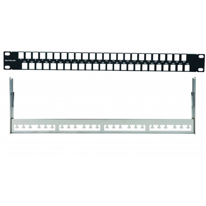 Наборная коммутационная панель размером 19", высотой 1U, вмещающая 48 портов под модули Keystone UTP/FTP с прямыми или угловыми штекерами. Изготовлена в практичной черной цветовой гамме, идеально подходящей для эффективного обустройства серверных и телекоммуникационных систем.