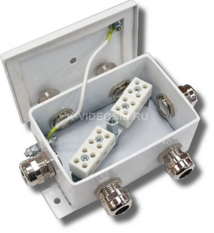 Корпус коробки целиком изготовлен из стали 2,5-3 мм. Имеет двойную защиту от коррозии (гальваническое покрытие и покраска). Крышка прижимается к корпусу через силиконовую прокладку. Винт крепления крышки снабжен уплотняющей тарельчатой шайбой с фторопластовым покрытием. Внутри корпуса коробки установлены керамические клеммные колодки, обеспечивающие соединение "под винт", и клемма заземления. В боковых стенках устанавливаются металлические кабельные вводы. Крепление коробки к элементам конструкций рекомендуется осуществлять на приварные пластины с применением гаек и винтов или с помощью саморезов и металлических дюбелей.