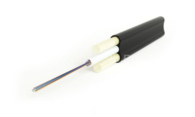 Конструкция кабеля: Этот кабель имеет плоскую форму, что способствует удобству его укладки и минимизации занимаемого пространства. Он оснащен периферийными стеклопластиковыми прутками, которые служат силовыми элементами, повышая жёсткость и защиту кабеля. Волокна заключены в оптический модуль с гидрофобным гелем (loose tube), что обеспечивает надежную защиту от влаги и улучшает производительность в сложных условиях эксплуатации.
