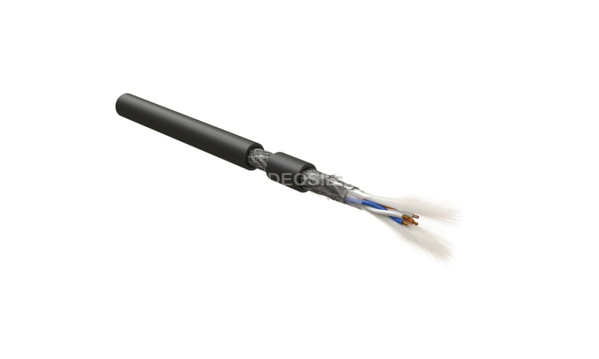 Hyperline RS-SF-2x2x24/7-PVC-BK-500 — экранированный кабель интерфейса RS-485 типа SF/UTP с двойным экраном (фольга и оплётка 85%), содержит 2 пары многопроволочных лужёных медных жил 24 AWG (7×0,203 мм), сечение 0,22 мм², изоляция из вспененного полиэтилена, чёрная PVC-оболочка, диаметр 7 мм, температурный диапазон эксплуатации -20°C…+70°C, предназначен для промышленной автоматизации и систем управления, подходит для внутренней и внешней прокладки, длина поставки 500 м.