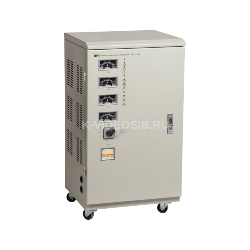 Стабилизатор напряжения электромеханического типа торговой марки IEK IVS10-3-15000 предназначен для поддержания стабильного трехфазного напряжения питания нагрузок бытового и промышленного назначения 3x220 В 50 Гц при отклонениях сетевого напряжения в широких пределах по значению и длительности.