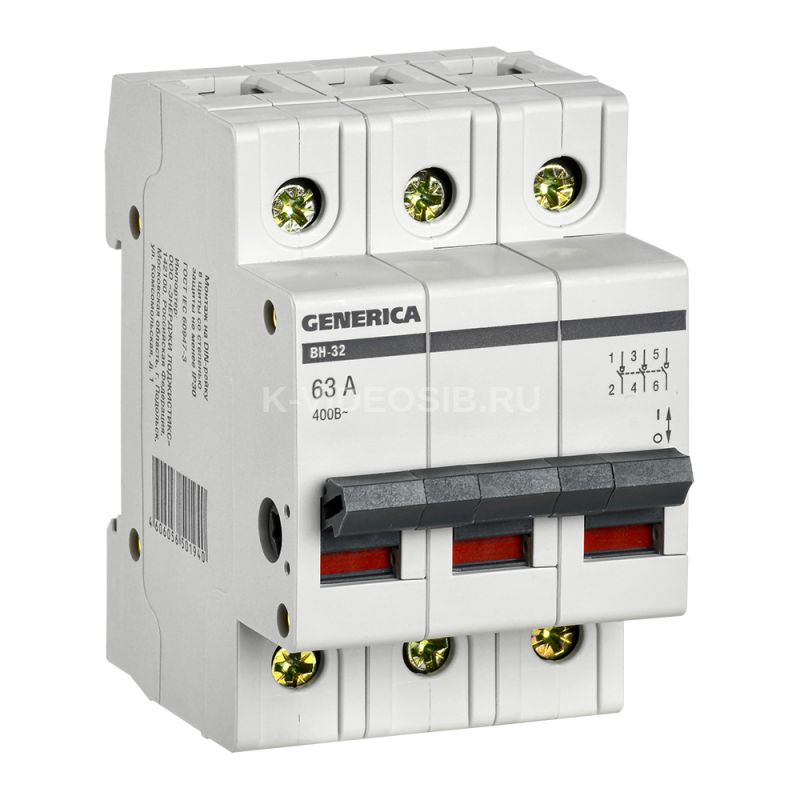 Выключатель нагрузки (мини-рубильник) ВН-32 3Р 63А GENERICA для для включения, проведения и отключения номинального тока в нормальных условиях эксплуатации, проведения тока в аварийных режимах, например, при коротком замыкании, а также для выполнения функций разъединения.