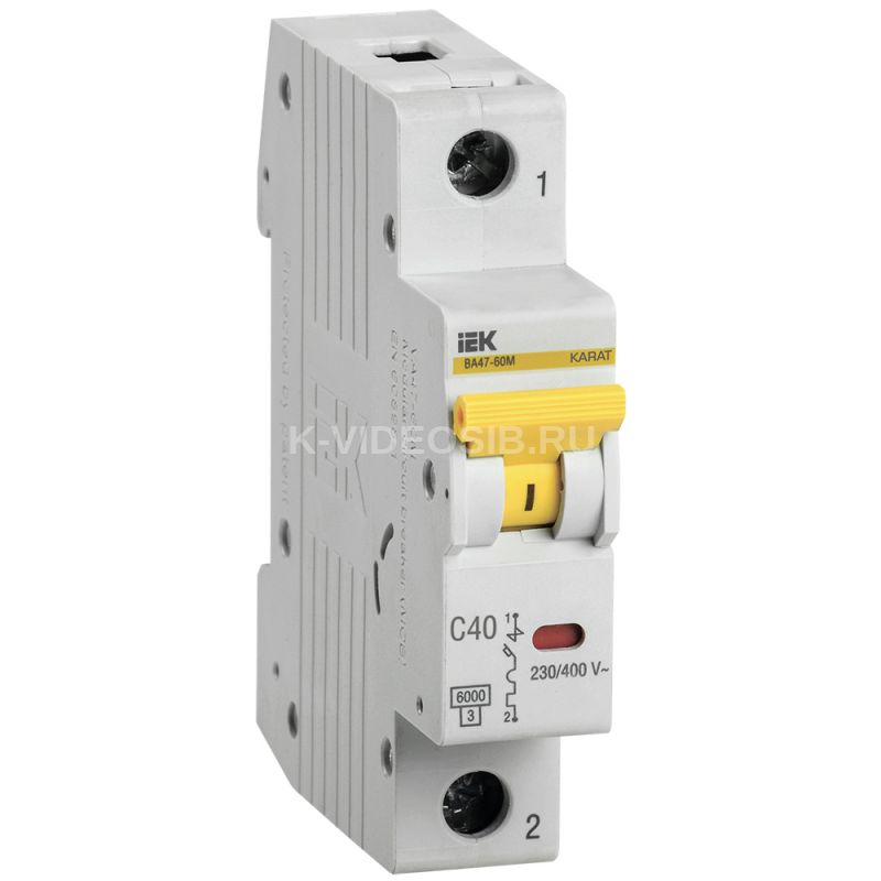 KARAT Автоматический выключатель ВА47-60M 1P C 40А 6кА IEK MVA31-1-040-C. Выключатели ВА47-60М выполняют функции автоматического отключения электроустановки при появлении сверхтоков и оперативного управления участками электрических цепей. Устройства прекрасно подходят для применения в групповых щитках (квартирные и этажные), а также в учетно-распределительных щитах административных и жилых зданий.