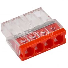 Строительно-монтажная клемма СМК 772-204 компактная IEK UKZ30-204-001. Количество подключаемых проводников – 4; место соединения – сбоку (поперечное); номинальное поперечное сечение – 2,5 мм²; цвет - красный; сечение одножильного жёсткого провода – 0,5...2,5 мм². Строительно-монтажная клемма серии 772 в прозрачном корпусе, без контактной пасты, предназначена для однократного подключения одножильных/ многожильных медных проводников.