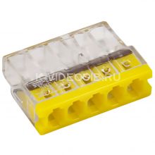Строительно-монтажная клемма СМК 772-205 компактная IEK UKZ30-205-001. Количество подключаемых проводников – 5; место соединения – сбоку (поперечное); номинальное поперечное сечение – 2,5 мм²; цвет-желтый; сечение одножильного жёсткого провода – 0,5...2,5 мм². Строительно-монтажная клемма серии 772 в прозрачном корпусе, без контактной пасты, предназначена для однократного подключения одножильных/ многожильных медных проводников.
