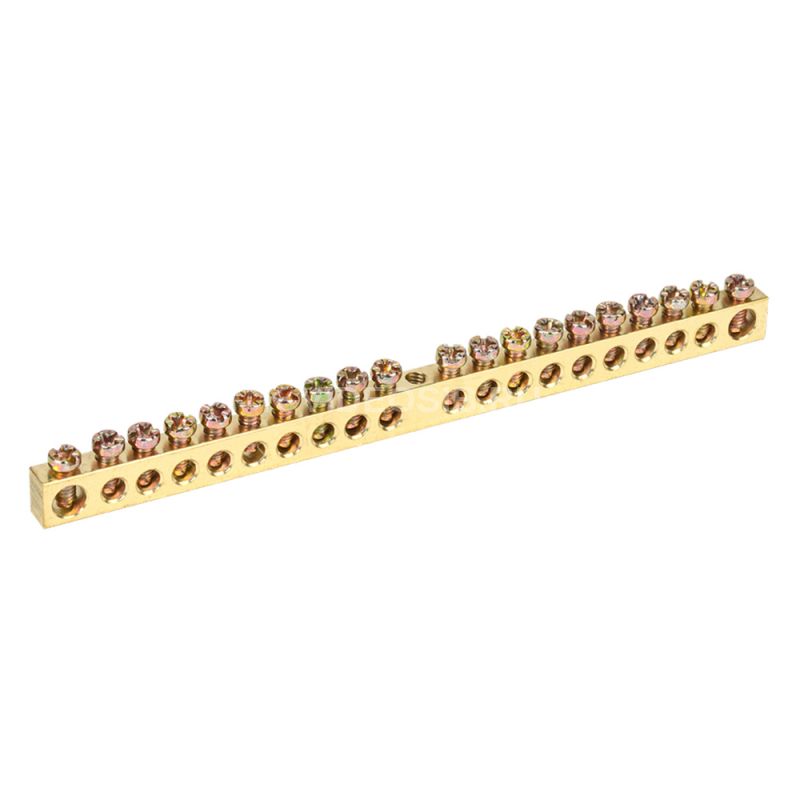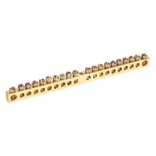 Шина PEN "земля-ноль" 6х9мм 20/1 (20групп/крепеж по центру) IEK YNN10-20-100. Применяются в щитовом оборудовании для подсоединения нулевых рабочих (N) и нулевых защитных проводов (РЕ). Крепление шины предусмотрено по центру (типы 8/1; 14/1) и по краям (типы 8/2 и 14/2) через изолятор нулевой шины на 35 мм монтажную DIN-рейку и через угловые изоляторы нулевой шины, а также непосредственно на панель щита. При подключении к шинам медных многожильных проводов рекомендуется оконцевание их наконечниками-гильзами. Выполнены из латуни.