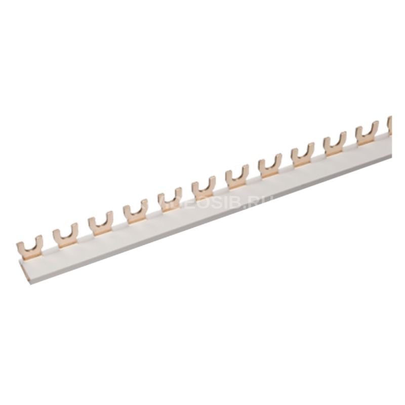 Шина соединительная типа FORK (вилка) 1Р 63А (1м) IEK YNS11-1-063. Применяются для удобного и безопасного соединения групп: ВА (выключатели автоматические), АД (автоматы дифференциальные), ВД (выключатели дифференциальные), ВН (выключатели нагрузки). Шины с шагом 18 мм предназначены для коммутации аппаратуры шириной, кратной одному модулю, шины с шагом 27 мм предназначены для коммутации изделий шириной, кратной полутора модулям. Шины, рассчитанные на номинальный ток 100 А, могут быть использованы с номинальным током 125 А, если вводной автомат подключать по центру. Для полуторамодульных шин имеются боковые заглушки.
