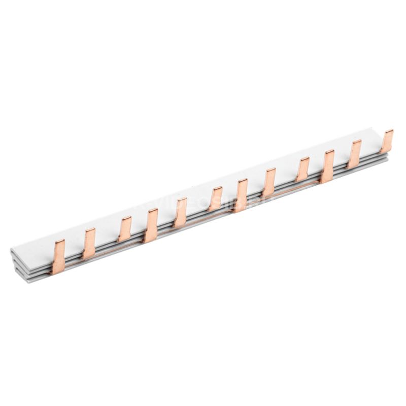 Шина соединительная типа PIN (12 штырей) 3Р 63А (22см) IEK YNS21-3-063-22-12. Применяются для удобного и безопасного соединения групп: ВА (выключатели автоматические), АД (автоматы дифференциальные), ВД (выключатели дифференциальные), ВН (выключатели нагрузки). Шины с шагом 18 мм предназначены для коммутации аппаратуры шириной, кратной одному модулю, шины с шагом 27 мм предназначены для коммутации изделий шириной, кратной полутора модулям. Шины, рассчитанные на номинальный ток 100 А, могут быть использованы с номинальным током 125 А, если вводной автомат подключать по центру. Для полуторамодульных шин имеются боковые заглушки.