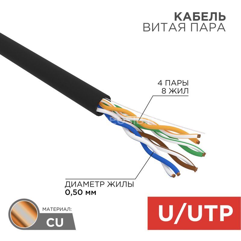 Технические характеристики Кабель U/UTP, CAT 5e, PE 4х2х0,50мм, 24AWG, внешний, черный, 50мм REXANT (01-0045-50)
