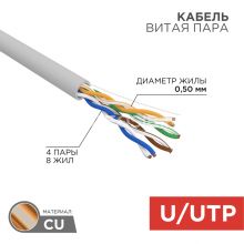 Кабель U/UTP, CAT 5e, PVC нг(А)-LS, 4x2x0,52 мм, 24AWG, внутренний, серый, 305м, РФ REXANT (01-0041-R)