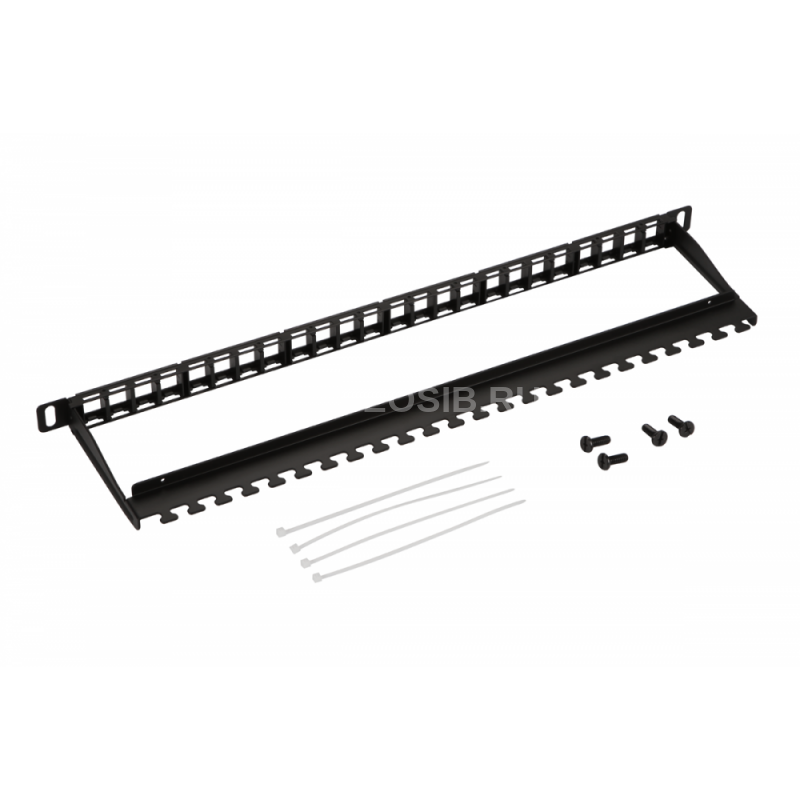 Может монтироваться в 19-дюймовую стойку, шкаф или настенную раму, а также на стену (с помощью дополнительных кронштейнов). Для удобства монтажа и дополнительной фиксации кабеля в комплектацию панели добавлена поддерживающая скоба. Использование скобы обеспечивает требуемый радиус изгиба и надежную фиксацию кабелей в процессе терминации и последующей эксплуатации. Фиксация кабеля осуществляется пластиковыми стяжками при помощи специальных отверстий в скобе.