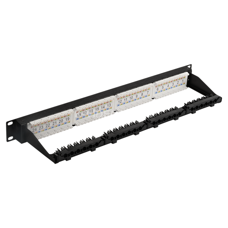 24-х портовая неэкранированная патч-панель предназначена для разделки на ней кабелей различных подсистем СКС и подключения отдельных составляющих сети друг к другу коммутационными шнурами.