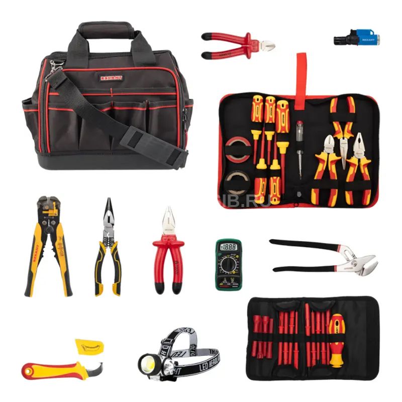 Набор инструментов электрика REXANT 12-4694-2 состоит из 29 предметов и позволяет провести весь цикл электромонтажа до 1000В. Диэлектрический набор имеет все необходимые инструменты для работы с напряжением до 1000В. В наборе собраны инструменты для зачистки кабеля, обжима клемм и безопасного подключения к щиту, а также диэлектрические отвертки с 14 шлицами, которые подойдут к любому оборудованию. Мультиметр обладает широким функционалом с функцией DATA HOLD и имеет подсветку. Налобный фонарь позволяет комфортно работать в слабоосвещённых местах. Тестер пробник со сменным наконечником удобен и прост в использовании. Сумка изготовлена из водонепроницаемого материала, что обеспечивает надежную защиту инструментов от воздействия влаги и повышает их долговечность. Набор подходит для профессионального использования.