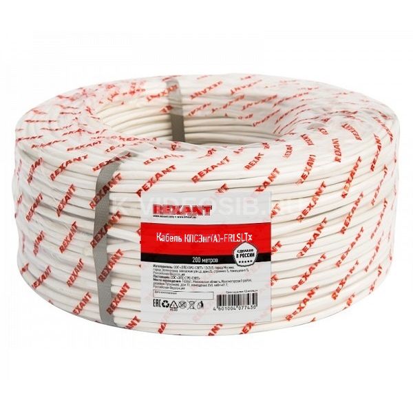 Огнестойкий безгалогенный кабель в экране REXANT Кабель КПСЭнг(А)-FRLSLTx 2x2x1,00мм² 200м (01-4939-1). Не распространяющий горение при групповой прокладке и не выделяющий коррозионно-активных газообразных продуктов при горении и тлении. Кабель состоит из однопроволочного медного проводника, изоляции из огнестойкой керамизирующейся кремнийорганической резины, дренажного медного проводника, экрана из алюминиевой фольги и оболочки из ПВХ пластиката пониженной пожарной опасности с низким дымо- газовыделением и низкой токсичностью. Кабель сохраняет работоспособность в условиях пожара в течение 180 минут. Номинальное напряжение тока до 300 В, частотой 50 Гц. Использование кабеля КПСЭнг(А)-FRLSLTx регламентирует сертификат соответствия Таможенного Союза (EAC). Применяется для одиночной или групповой прокладки (с учетом объема горючей загрузки) цепей питания электроприемников систем противопожарной защиты, операционных и реанимационно-анестезионного оборудования больниц и стационаров, в местах большого количества скопления людей (больницы, школы, сады, торговые центры, аэропорты, вокзалы, метро), а также в других важных системах жизнеобеспечения, которые должны сохранять работоспособность в условиях пожара. Кабель КПСЭнг(А)-FRLSLTx применяют внутри и вне помещений, при условии защиты от прямого воздействия солнечного излучения и атмосферных осадков. Цвет кабеля — белый. Рабочая температура: –40...+60 °С. Температура прокладки кабеля: –10…+50 °С. Материал кабеля КПСЭнг(А)-FRLSLTx: - Токопроводящие жилы — однопроволочные из медной мягкой проволоки. - Экран и оболочка — алюминиевая фольга из ПВХ пластиката пониженной пожарной опасности с низким дымо- газовыделением и низкой токсичностью. - Изоляция — огнестойкая керамизирующаяся кремнийорганическая резина. - Скрутка — симметричный, парной скрутки.