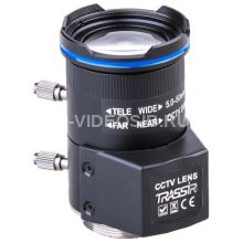TRASSIR TR-L4M2.7D5-50IR - вариофокальный объектив с фокусным расстоянием 5–50 мм, апертурой F/2.0, ИК-коррекцией предназначен для аналоговых и IP-камер видеонаблюдения с разрешением до 4 Мп (2688x1520), базирующихся на матрице 1/2.7", 1/3", 1/4".
