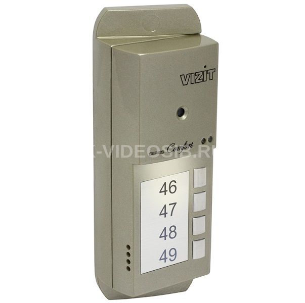 VIZIT БВД-444CP-4-R - комплект блока вызова на 4 абонента для совместной работы с БКМ-444. Встроенная телекамера цветного изображения с функцией "День-ночь" (380 tvl, PAL, 0 Lux / ИК подсветка для телекамеры, объектив 90 градусов). Подсветка кнопок вызова и шильдов. Подставка для поворота блока на 20 градусов. Считыватель RD-3, ключи VIZIT-RF2.1 - 5/10/20 шт. в комплекте.