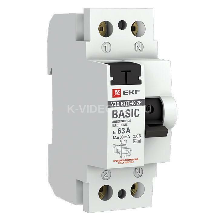 Технические характеристики Выключатель дифференциального тока (УЗО) 2п 63А 30мА тип AC Basic электрон.EKF elcb-2-63-30e-sim