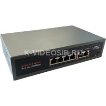 Сетевой POE коммутатор на 4 порта RJ45+ 2 порта uplink 100Мб, с поддержкой технологии PoE (питание по Ethernet кабелю). Стандарт POE: IEEE 802.3af/at адаптивный. Бюджет питания: 78Вт.Грозозащита: до 4КВт. Размеры: 200 x 115х44 мм. Питание: 100~240В AC,50/60Гц.