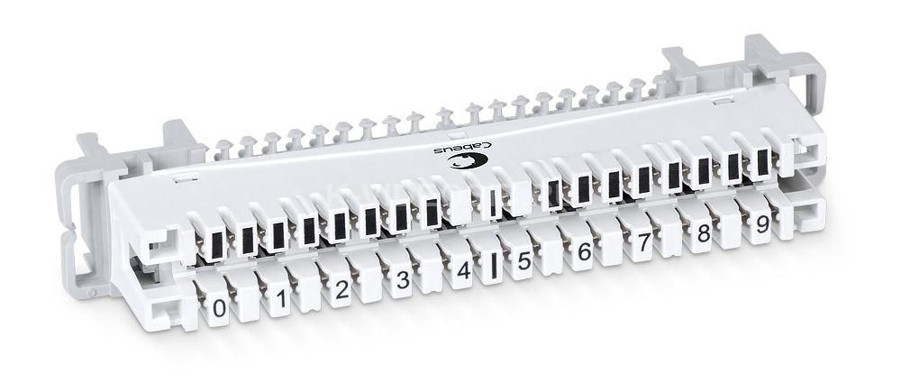 Плинт соединительный KRONE предназначен для использования в телефонных линиях для организации неразъемного соединения. Конструкция плинта предполагает его установку как в настенные монтажные хомуты, устанавливаемые в стандартные шкафы или стойки 19”, так и на раму-штангу с круглыми направляющими. Тестирование соединений может осуществляться с использованием тестовых шнуров TC-2-pin-6P2C или TC-2-pin-ST. Возможна также установка комплексной защиты от перенапряжений в виде кассет для разрядников PrMag с разрядниками 3-pole GTA. Маркировка кроссировочной стороны плинтов произведена от 0 до 9.