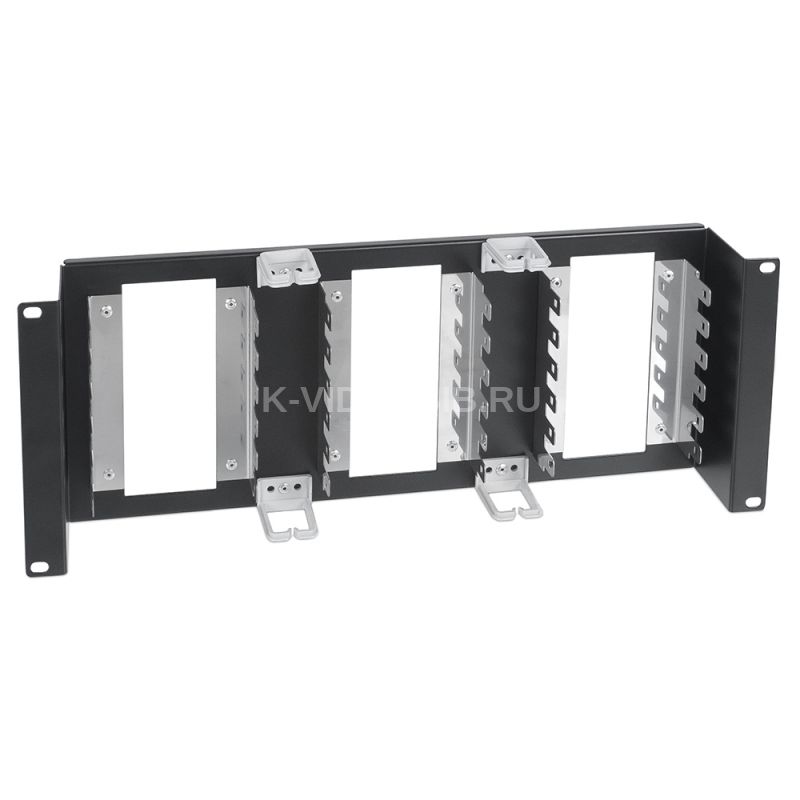 Рама 19” с монтажными хомутами, предназначена для установки на неё 18-ти плинтов типа KRONE. Используется для установки в шкафы и стойки стандарта 19”.
