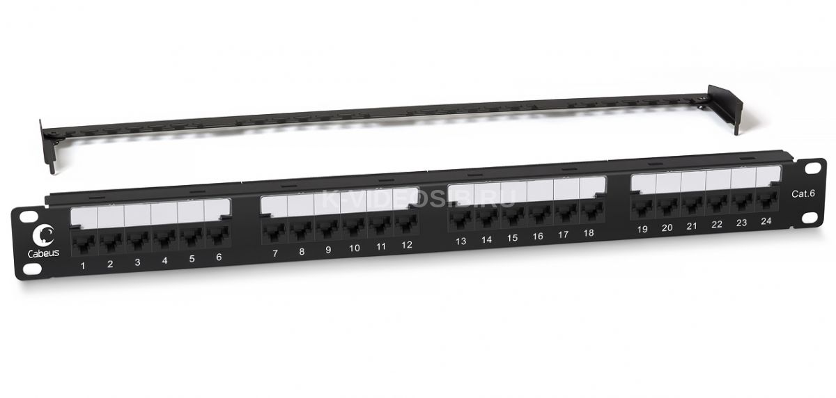 Коммутационные панели (патч-панели) предназначены для терминирования на них кабелей различных подсистем СКС и для коммутации отдельных элементов сети друг с другом при помощи коммутационных шнуров. Неэкранированная патч-панель Cabeus выполнена в 19” формате и предназначена для установки в телекоммуникационные шкафы и стойки. Соответствует характеристикам категории 6. С лицевой стороны все порты пронумерованы и имеют дополнительные поля для нанесения маркировки. С тыльной стороны патч-панели размещены контакты типа Dual IDC с цветной маркировкой по двум стандартам: T568 А и B. Ножи контактов располагаются под 45°, что лучше сказывается на передаточных характеристиках разъема. Для заделки проводников подходят ножи тип 110 и Krone. В комплект патч-панели входит съемный задний организатор для фиксации кабелей.