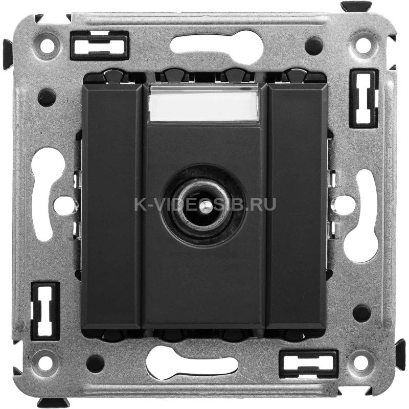 Розетка TV проходная в стену. Предназначена для монтажа в подрозеточные коробки глубиной не менее 45 мм (код 59301). Используется для подключения телевизионного кабеля к телевизору. Винтовые зажимы. Диапазон рабочих частот 4–2400 МГц; затухание <1 дБ. 2 модуля. Цвет: "Черный матовый".