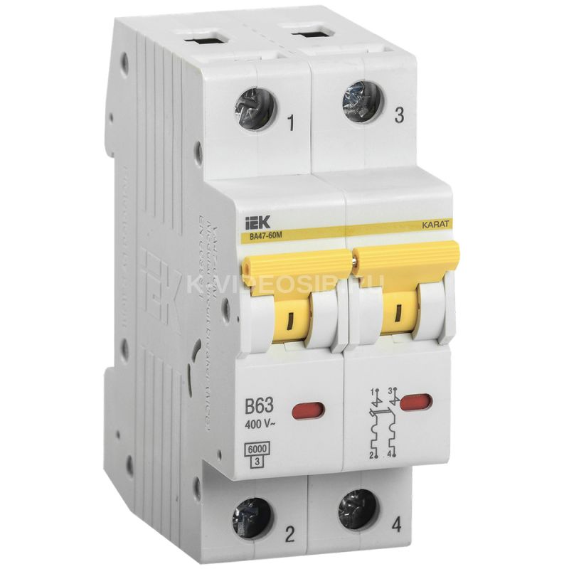 KARAT Автоматический выключатель ВА47-60M 2P B 63А 6кА IEK MVA31-2-063-B. Выключатели ВА47-60М выполняют функции автоматического отключения электроустановки при появлении сверхтоков и оперативного управления участками электрических цепей. Устройства прекрасно подходят для применения в групповых щитках (квартирные и этажные), а также в учетно-распределительных щитах административных и жилых зданий.