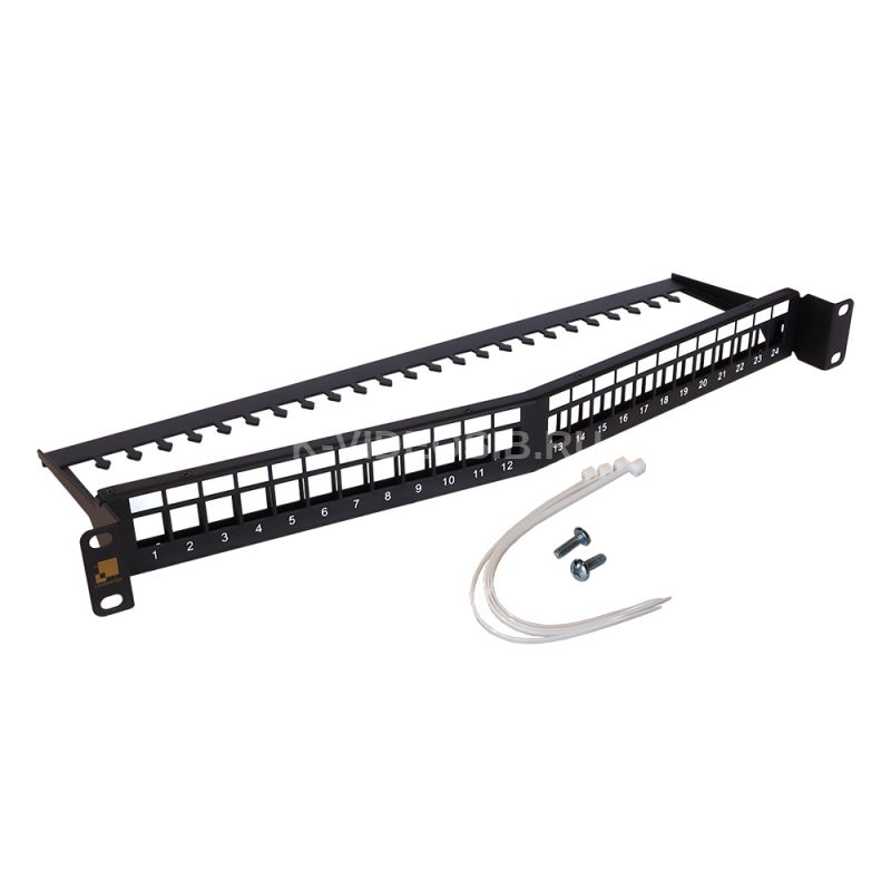 Особенность панели – угловая конструкция, которая обеспечивает корректный радиус изгиба патч-кордов, подключаемых к патч-панели. Вследствие чего использование таких патч-панелей рекомендовано при организации горизонтальной и магистральной подсистем СКС категории 6 и 6А.