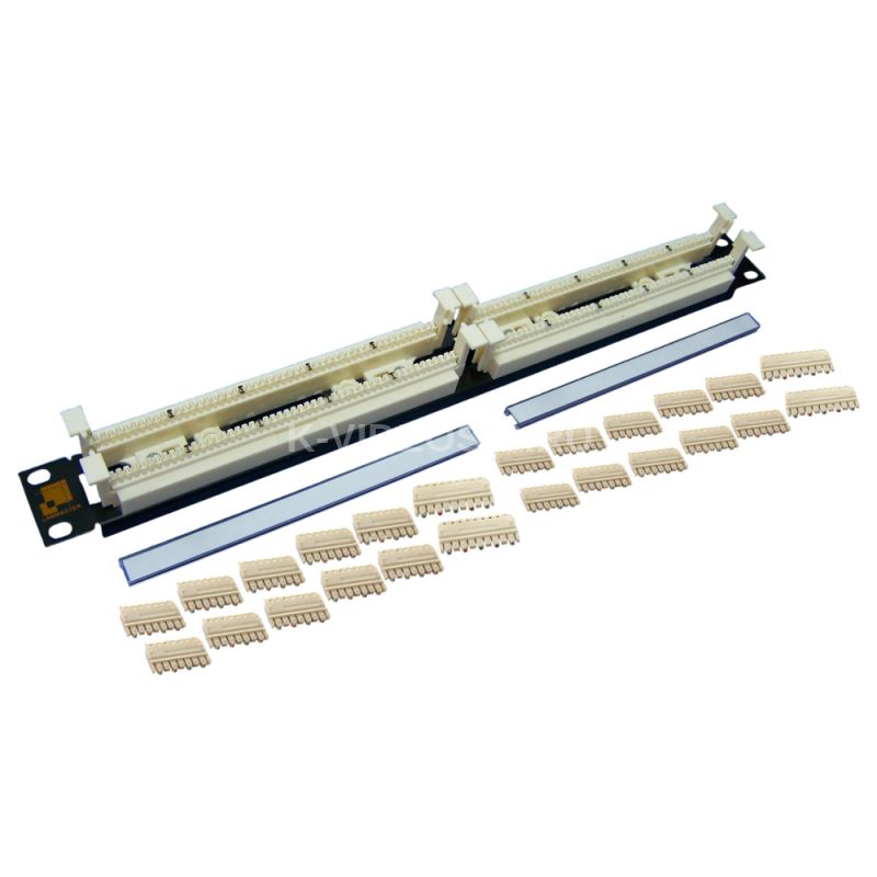 Кросс - 1 шт. Соединительный блок 4-парный - 20 шт. Соединительный блок 5-парный - 4 шт. Держатель маркировки - 2 шт. Бумажная полоска для маркировки - 2 шт. Может монтироваться в 19-дюймовую стойку или настенную раму. Для удобства монтажа, пазы, в которые забивается кабель, имеют цветовые метки через каждые 5 пар. Основным преимуществом 110 кроссов является возможность коммутации каждой отдельно взятой пары, что обеспечивает гибкую конфигурацию СКС. Для упорядочивания кабельных потоков и удобства обслуживания совместно с кроссами рекомендуется устанавливать кабельные органайзеры LANMASTER. Коммутационный блок имеет площадки для маркировки, Размеры кросса: высота 1U x ширина 19".