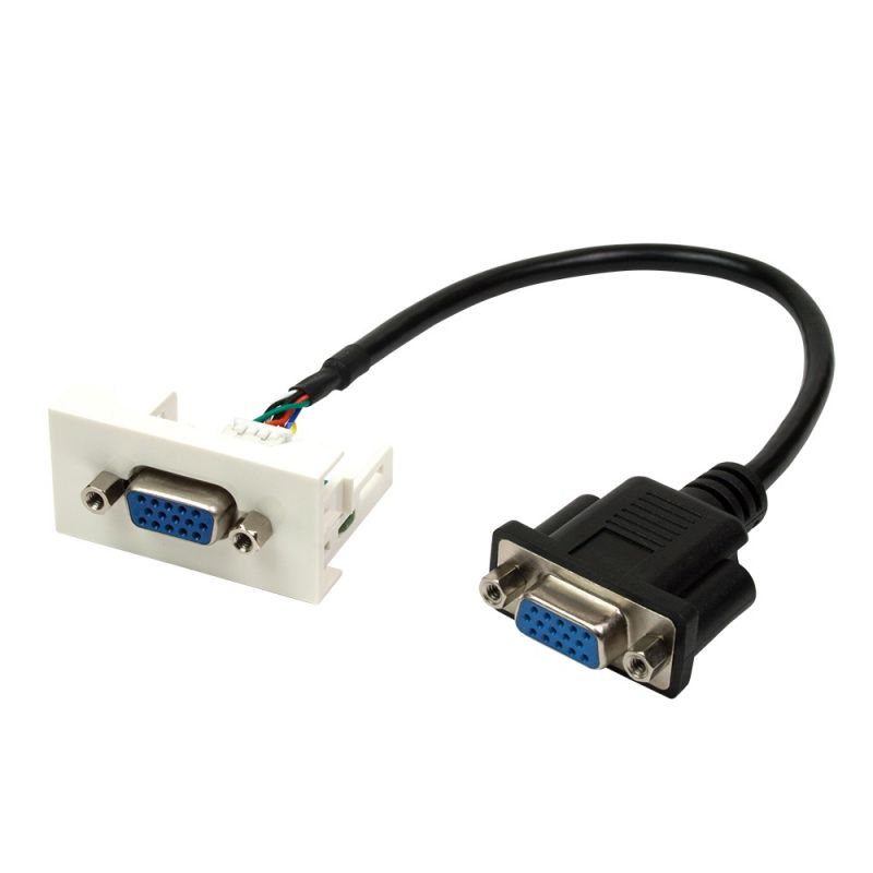 Вставки стандарта Mosaic используются для комплектации розеток, а также для установки в лючках,настенных блоках, башенках и миниколоннах. Вставки имеют размер 22.5х45 мм, что позволяет устанавливать по 2 вставки на 1 пост. Лицевая панель предназначена для организации точек подключения мониторов или проекторов с разъемами VGA/SVGA D-Sub. С лицевой стороны модуль оснащен разъемом D-SUB (HDB-15) мама. С тыльной стороны панели находится удлинительный кабель длиной 20 см или 3 м. Кабель оконцован разъемом D-SUB (HDB-15) мама, обеспечивает удобное подключение VGA-кабелей, подходящих с внутренней стороны розетки. |
