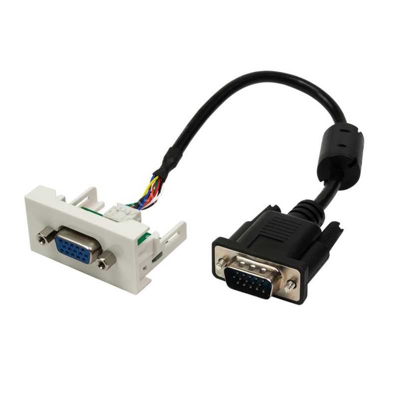 Лицевая панель предназначена для организации точек подключения мониторов или проекторов с разъемами VGA/SVGA D-Sub. С лицевой стороны модуль оснащен разъемом D-SUB (HDB-15) мама. С тыльной стороны панели находится удлинительный кабель длиной 20 см или 3 м. Кабель оконцован разъемом D-SUB (HDB-15) папа, обеспечивает удобное подключение VGA-кабелей,подходящих с внутренней стороны розетки.