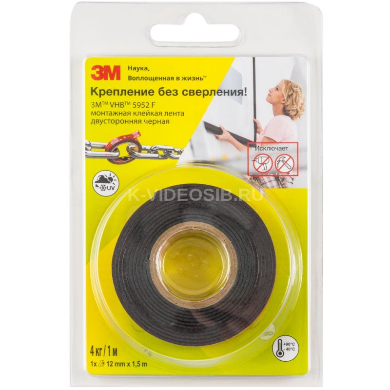Описание Монтажная универсальная лента 3М VHB 5952F чёрная 12 мм х 1,5 м 4631136349280