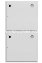 Секции шкафа имеют равные размеры и расположены друг над другом. Верхний отдел укомплектован двумя поворотными корзинами, в которых хранятся свернутые в скатку пожарные напорные рукава. В отделении внизу хранятся два огнетушителя.
