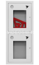 Секции шкафа имеют равные размеры и расположены друг над другом. Верхний отдел укомплектован одной поворотной корзиной, в которой хранятся свернутый в скатку пожарный напорный рукав. В отделении внизу хранятся два огнетушителя.