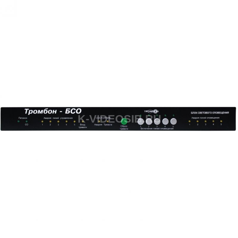 Прибор Оникс ТРОМБОН-БСО (блок светового оповещения) для ручного управления и контроля 5 линиями оповещения с коммутируемым током в линии одного входа 4А-15мА и сопряжением по интерфейсу RS 485 для связи и выдачи информации системы ГО со сбросом тревожного состояния. Включение световых оповещателей ручное с ПУ или дистанционно со световой индикацией аварии по линии оповещения. Питание Тромбон БСО: 12-24 В, световых оповещателей – СС 10,5-28 В.