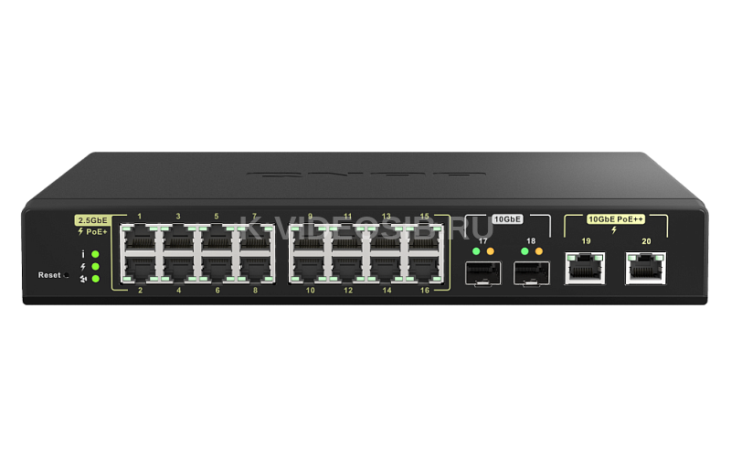 Сетевые интерфейсы: 2 x 10 Гбит/с SFP+ 2 x 10 Гбит/с RJ-45 16 x 2,5 Гбит/с RJ-45 Всего PoE-портов 18 PoE++ PSE (802.3bt, 90 Вт) Порты с 19 по 20 PoE+ PSE (802.3at, 30 Вт) Порты с 1 по 16 PoE PSE (802.3af, 15,4 Вт) Порты с 1 по 16