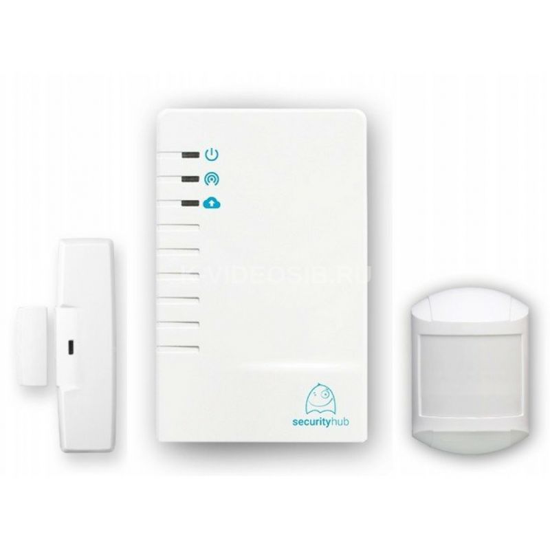 - комплект состоит из абонентского контроллера Security Hub (SH) с аккумуляторной батареей, сетевого адаптера с кабелем USB, радиодатчиков движения и открытия двери/окна с элементами питания. Функционал комплекта расширяется беспроводными датчиками разбития стекла, протечки воды, задымления и др.;
