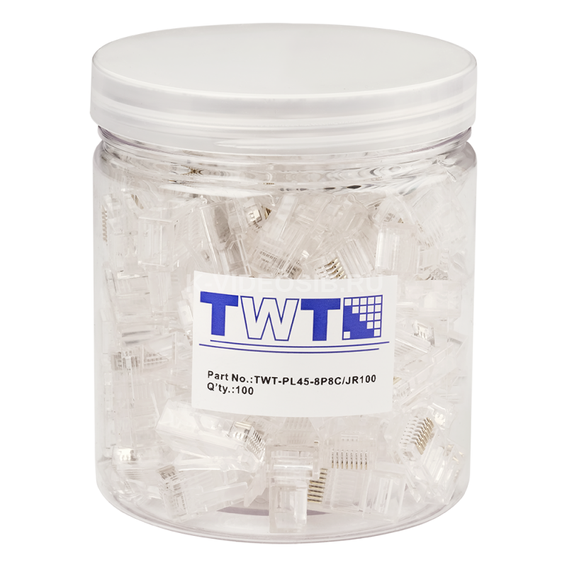 Для удобства хранения и использования, коннекторы под артикулом TWT-PL45-8P8C/JR100 поставляются в пластиковых прозрачных банках с накручивающейся крышкой.