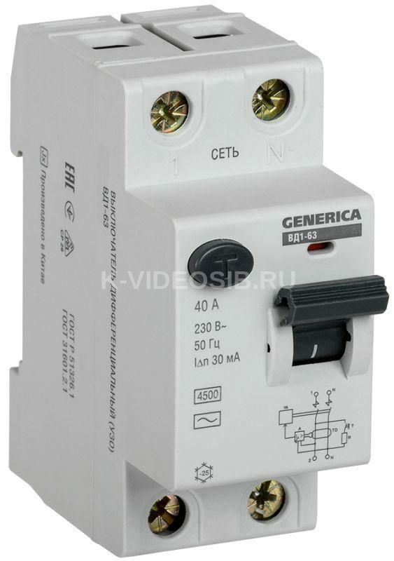 Описание Выключатель дифференциального тока (УЗО) 2п 40А 30мА тип AC ВД1-63 GENERICA MDV15-2-040-030