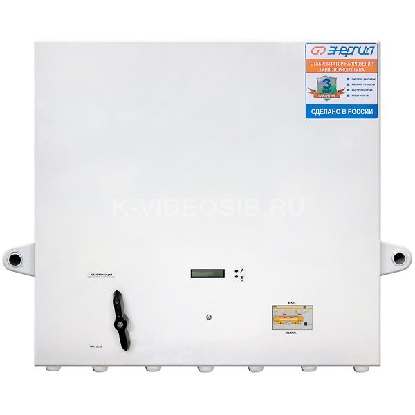 Энергия 35000 ВА Ultra Е0101-0108 - тиристорный стабилизатор 220В Энергия Ultra 35000 мощностью 35 кВА (≈26 кВт) с допустимым диапазоном входного напряжения 60-265В и погрешностью выходного в 3% (213-227В).