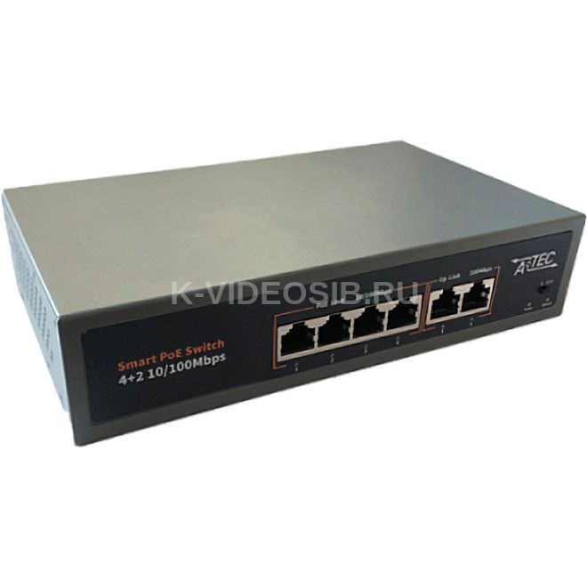Сетевой POE коммутатор на 4 порта RJ45+ 2 порта uplink 100Мб, с поддержкой технологии PoE (питание по Ethernet кабелю). Стандарт POE: IEEE 802.3af/at адаптивный. Бюджет питания: 78Вт.Грозозащита: до 4КВт. Размеры: 200 x 115х44 мм. Питание: 100~240В AC,50/60Гц.
