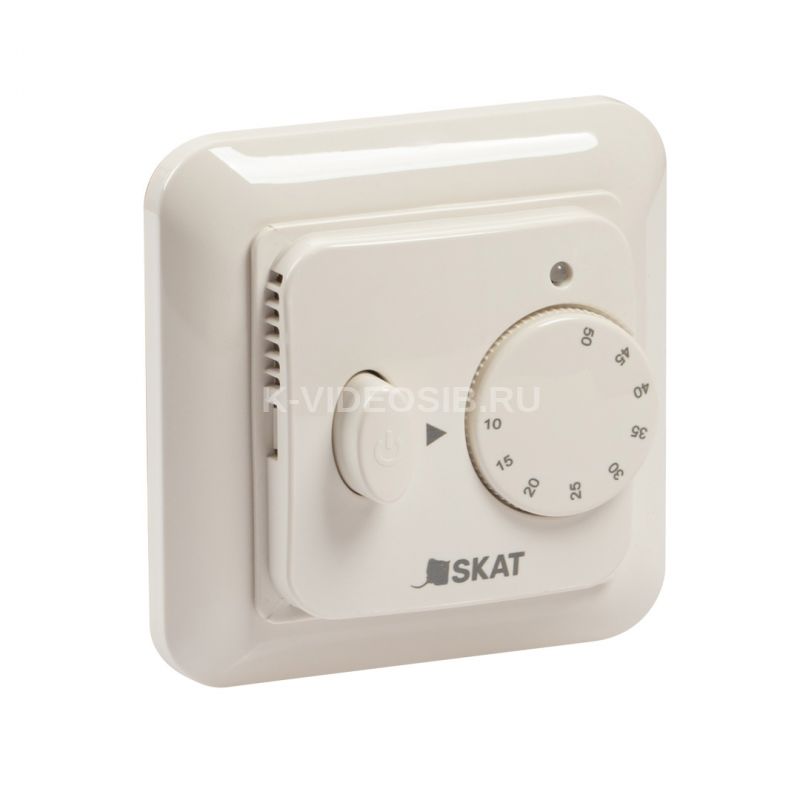 SKAT HT TS 16A Base представляет собой прибор, устанавливаемый в обыкновенную внутреннюю электромонтажную коробку рядом с любой удобной розеткой. Высота установки — от 50 см. Если в доме есть дети - учитывайте это, однако имейте ввиду, что длина питающего провода от термоматов TEPLOCOM МНД и провода термодатчика составляет 2 метра. На лицевой панели SKAT HT TS 16A Base есть градуированный диск управления (ручка) и сигнальный светодиод красного цвета, включающийся при подаче напряжения на тёплые полы, и мигающий в случае аварии термодатчика. Существующая мощность подключаемой нагрузки составляет 16 А, что позволяет подключать любые комплекты тёплых полов из линейки SKAT HT TS 16A Base.