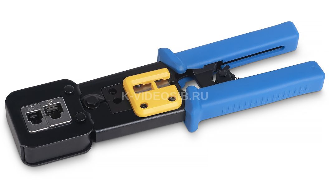 Инструмент используется для обжима коннекторов RJ-45 быстрой установки со сквозными отверстиями. Благодаря встроенной гильотине, при срабатывании механизма обжима, лишняя длина проводников автоматически обрезается.